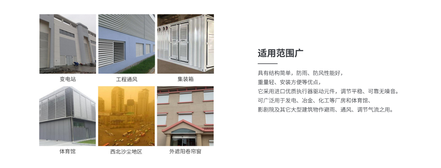 該百葉窗具有結構簡單,防雨、防風性能好,重量輕、安裝方便等優點, 它采用進口優質執行器驅動元件,調節平穩、可靠無噪音。 可廣泛用于發電、冶金、化工等廠房和體育館、影劇院 及其它大型建筑物作避雨、通風、調節氣流之用。