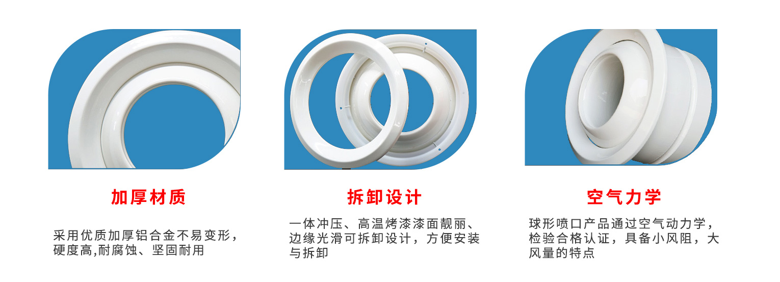 球形噴口可以分為氣動或電動的控制系統。由于采用最佳的空氣動力學噴口結構設計,達到了理想的噪聲的控制,又由于它的高品質的外形設計,可用于音樂廳、劇場、博物館等高級場所 普通開關型:增加6組鋁合金葉片,通過手動調節葉片來調節風量大小 電動執行機構型:220V電動控制調節葉片來調節風量大小。