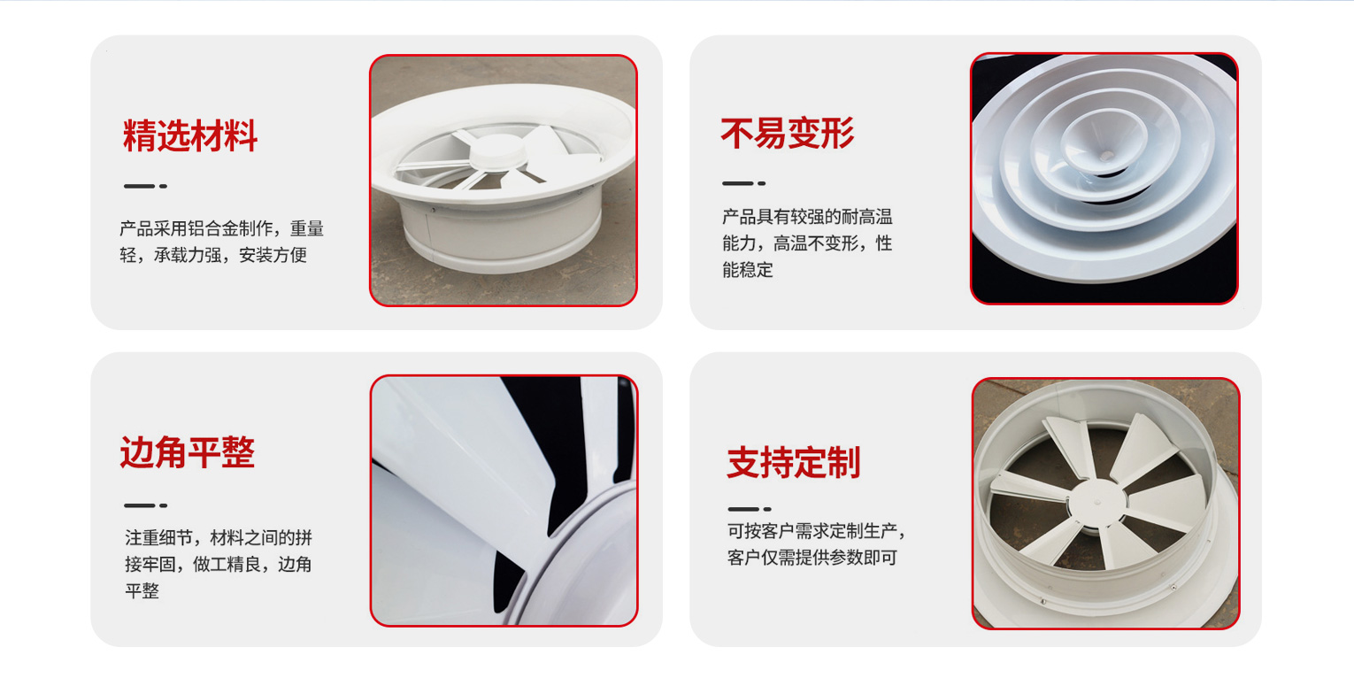 旋流風口可分為手動旋流風口,電動旋流風口兩種。 手動旋流風口:必須人為手動調制相應角度才能送風。 電動執行機構型:電動旋流風口可用開關控制,220V電動控制調節葉片來調節風量大小,隨意調至送風角度。