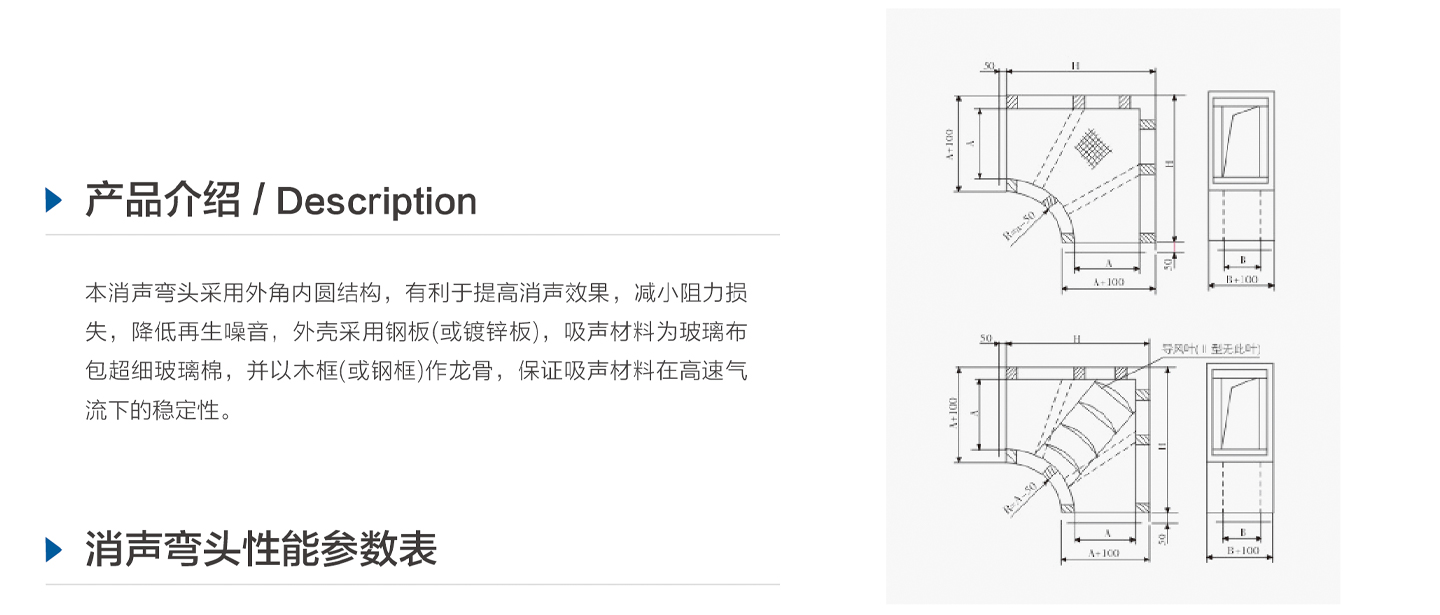 本消聲彎頭采用外角內圓結構,有利于提高消聲效果,減小阻力損失,降低再生噪音,外殼采用鍍鋅板。 吸聲材料為玻璃布包超細玻璃棉,保證吸聲材料在高速氣流下的穩定性。
